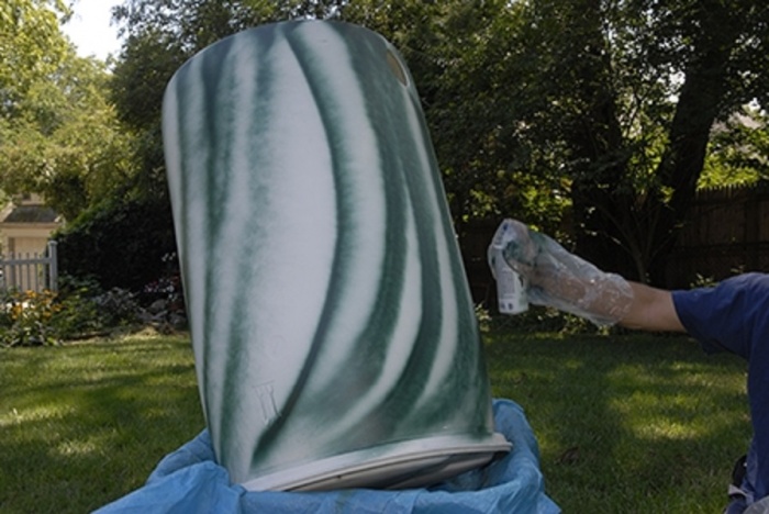 • Наносят на всю наружную поверхность емкости краску-основу (самую светлую), равномерно покрывая ею стенки.