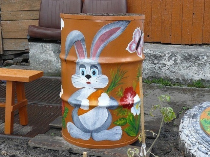 Для художественной росписи можно использовать не только металлические бочки, подойдут и пластиковые. С этими работать проще. Их не нужно предварительно зачищать и грунтовать, достаточно тщательно вымыть и высушить. Важно правильно подобрать краски для разной фактуры.