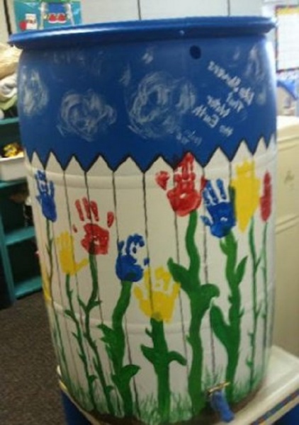 • Оригинально выглядит разрисованная бочка, где в качестве декора все члены семьи оставили отпечатки ладоней.