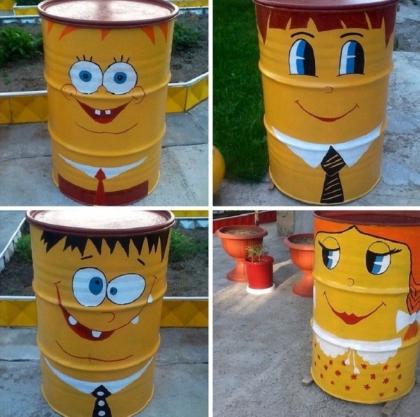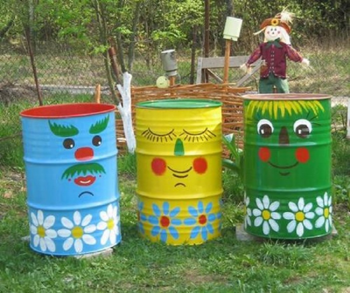 Абсолютно на каждом дачном участке можно увидеть несколько старых емкостей для воды, в основном бочек. Данные емкости используются для полива растений, а так же в качестве резерва, если вдруг воду на участке отключат.Раскрашенные бочки на дачеЧто бы вид бочек (в основном это ржавые резервуары) не портил ландшафтный дизайн участка их можно красиво оформить с помощью красок.Раскрашенную бочку можно установить где угодно: в саду на газоне, между грядками овощей, впалисаднике, на крыльце дачи и т.д.Данная идея пользуется популярность из-за того, что практически не требует усилий и денежныХ средств.Сейчас рассмотрим технологию оформления пластиковых и металлических бочек на даче.Как раскрасить бочки на даче?Для начала необходимо подобрать подходящие бочки. Красивее всего смотрятся большие 200-литровые бочки, т.к. на них можно сделать рисунки любой сложности.Что бы раскрасить бочку своими руками Вам понадобятся:Пустые чистые бочки для водыЩетка по металлу и наждачная бумагаВодоотталкивающие краски различных цветовРастворительКисточкаПростой карандашРаботать с пластиковой бочкой намного проще, т.к. перед покраской ее необходимо только тщательно вымыть и высушить.При оформлении металлической бочки для начала нужно полностью удалить всю ржавчину. Для этого рекомендуется использовать щетку по металлу либо наждачную бумагу. Как только вся ржавчина будет удалена, рекомендуется обработать поверхность бочки тряпкой, смоченной в спирт. Данное мероприятие позволит обезжирить поверхность перед покраской.После подготовки бочки к покраске необходимо продумать рисунок. Тут уже все зависит от вашей фантазии. Наиболее выигрышно смотрятся бочки, на которых изображают следующие рисунки:Сказочные персонажиЖивотныеЛюди (к примеру, мальчик с девочкой)ЦветкиСоздав эскиз рисунка на бумаге, необходимо перенести его на бочку. Для этого сначала бочка краситься в один цвет (полностью). Далее с помощью кисточки наводятся контуры рисунка, которые в дальнейшем раскрашиваются подходящей краской.Что бы раскрасить бочку красиво и при этом задействовать в работу всю семью рекомендуется сначала покрасить емкость в один цвет и подождать пока краска высохнет. Далее, используя краски разного цвета, можно оставить на бочке отпечатки рук каждого члена семьи. Такая идея сделает бочку креативной и станет памятью для всей семьи.Бочка с семейными отпечаткамиПосле того, как бочка полностью высохнет, установите ее в подходящее место на даче и наслаждайтесь обновленным ландшафтным дизайном.Хотелось бы так же отметить, что бочку можно дополнительно украсить цветами. Для этого внутрь емкости необходимо высыпать плодородную почву и посадить подходящие растения.Раскрашенная бочка для воды с цветамиЕще один совет – фон рисунка на бочках делайте разным. К примеру, одну бочку покрасьте в красный цвет, а вторую в зеленый. Контраст оттенков сделает композицию из бочек более привлекательной.Фото раскрашенных бочек на дачеЧто бы Вы наглядно увидели данную идею для сада, предоставляем к вашему вниманию фото раскрашенных бочек на даче:Голубая раскрашенная бочкаИдея использования раскрашенной бочкиКрасивая бочка для водыПростое оформление бочки для водыОформление бочки в стиле поп-артРисунок зайчика на бочкеКрасивые бочки в садуРаскраска бочки своими рука