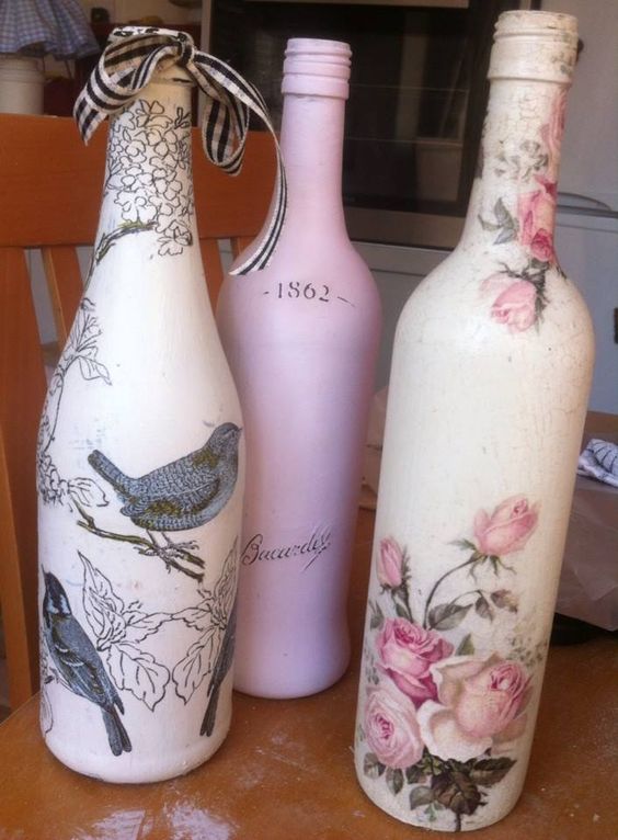 Чаще всего для украшений помещений, оформленных в стиле Прованс или шебби шик, используется техника декупаж и искусственное состаривание. На бутылки не только наносятся различные изображения (чаще всего цветы и другие растения, птицы, насекомые), но и создается покрытие, которое имеет трещинки и даже сколы.