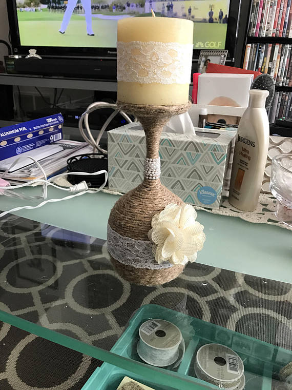 Как и в других случаях, первый этап работ состоит в удаления этикетки и тщательного промывания, просушки. Смочите внутреннюю сторону шпагата клеем и плотно обматывайте изделие нитями. После того, как клеящее вещество высохнет, при необходимости продолжите украшение, к примеру, якорями и спасательными кругами для морского стиля, либо кружевом для стиля шебби-шик. Стоит отметить, что и при декорировании одним лишь шпагатом получается достаточно самобытный и интересный предмет, прекрасно вписывающийся практически в любое помещение.