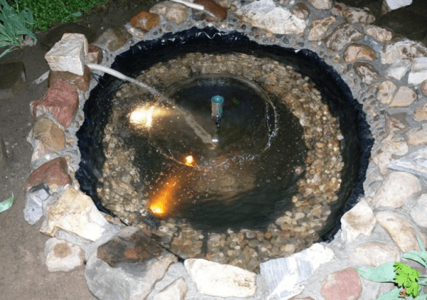 Пруд, который у вас получился очень просто оживить при помощи фонтанчика. В этом случае использовать можно насос небольших размеров, либо турбину с насадкой для аквариума. Данные приборы будут работать от электричества. Поэтому провод можно убрать в шланг либо прикопать в землю.