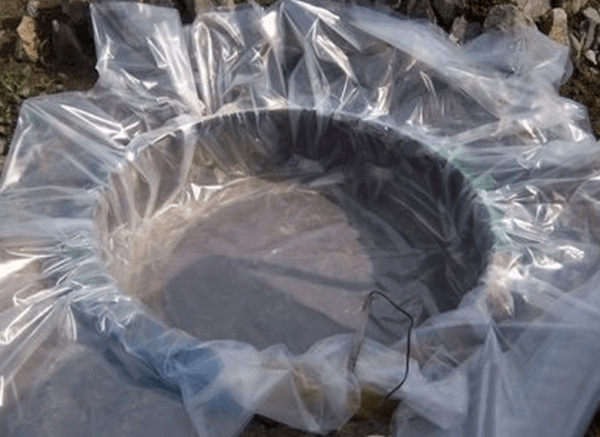 Купить его нужно исходя из того, что он должен выступать за стенки покрышки на полметра. В крайнем случае, подойдет толстый полиэтилен. Но прослужит он гораздо меньше. Поэтому, отдав предпочтение ему, нужно учесть, что потребуется замена, невозможная без демонтажа сооружения. Распределив по дну вырытой ямы выбранный материал, его выводят за края камеры, помещенной в яму;