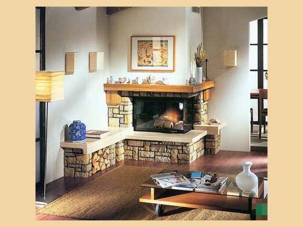 Настоящую русскую печь сложить сможет только профессионал. Специальность это редкая и очень востребованная. К хорошему печнику в очереди люди ждут по несколько лет. Однако и камин в стиле «кантри» не испортит, как говорится, обедни. Сложенный из колотых блоков песчаника теплых оттенков, с декоративными отшлифованными элементами и массивной деревянной каминной полкой он будет уместен в таком интерьере. А у вас будет возможность воспользоваться плодами технического прогресса, не отходя от выбранного стиля. Печи таких каминов имеют обычно очень высокий КПД и оборудованы системой принудительной подачи теплого воздуха по скрытым патрубкам в другие помещения дома. Так что вы не только гостиную деревенского дома красивым камином украсите, но и весь дом эффективно отопите. Через жаропрочную стеклянную дверцу печи камина вечерами будет очень приятно любоваться танцем языков пламени в топке. Надо признать, что при всех достоинствах русской печи, стеклянной жаропрочной дверцы она не имеет.