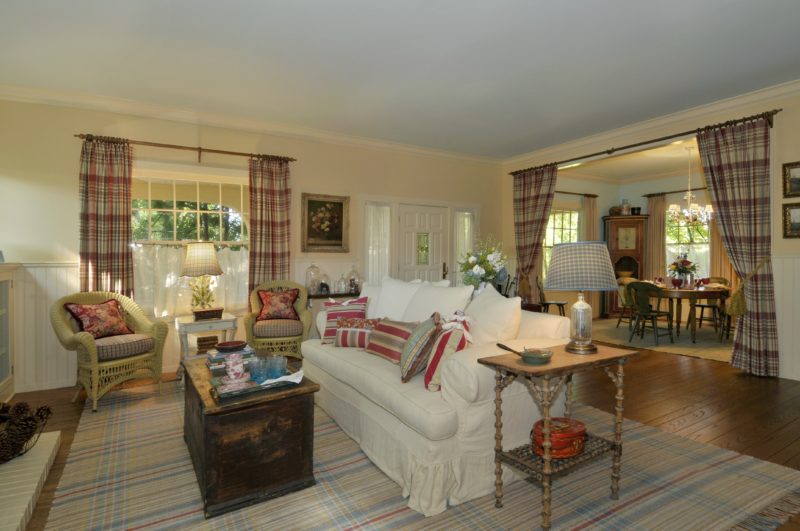 Особый шарм и уют дому с сельским колоритом придает его текстильное оформление. Различные виды изделий из ткани и мягких материалов (шторы, декоративные подушки, съемные мебельные чехлы, ковровые дорожки, пледы объемной вязки) применяются в разных вариантах деревенского дизайна.