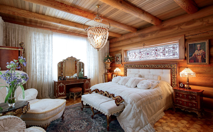 В коттеджах, в дачных и охотничьих домиках балки уже могут быть не имитацией, а полноценными элементами несущей конструкции, наряду с деревянными колоннами и стропилами. Здесь мы имеем классическое единство художественной выразительности с функциональностью.
