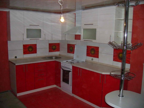 Наносится на МДФ или ДСП панель. Это долговечный гарнитур, который не потеряет форму и алый цвет. Красный фасад с алюминиевыми вставками и стеклом увеличивают срок эксплуатации гарнитура.