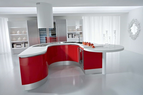 Красный островной гарнитур подходит для просторного помещения, экономит время передвижения, а не пространство. Островом в гарнитуре называется главный стол, который может быть вспомогательной рабочей поверхностью с раковиной или кухонной плитой, барной стойкой.