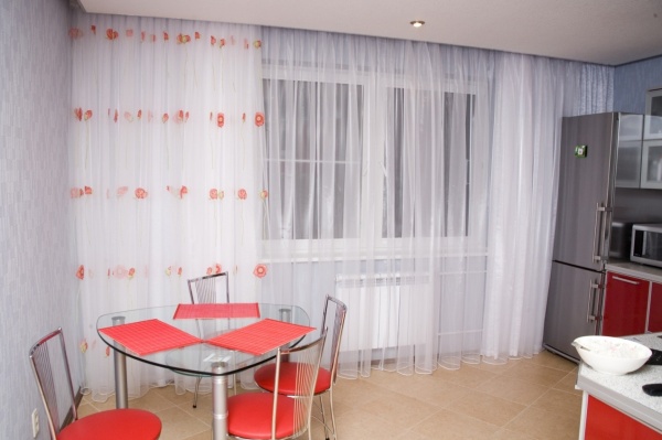 С красным гарнитуром лучше сочетать нейтральный оттенок штор в светлых тонах. Кухонные занавеси могут быть с красными полосами, красными петлями или подхватами, бордовой вышивкой или вставкой.
