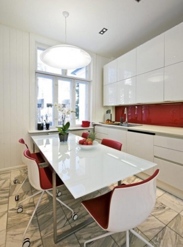 Любителей оформить интерьер кухни белой мебелью на красном фоне меньшинство. Но и здесь есть простор для творческой фантазии. Поистине королевскую изысканность привносит в дизайн кухни красный фартук, подчеркивающий торжественность белого гарнитура. Помимо сплошной однотонной плоскости, поверхность над рабочим столом может быть выложена из плитки с красными вкраплениями. Применив аналогичный прием на полу, вы достигнете гармоничного единства элементов дизайна кухни.