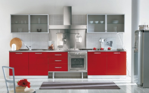 • Приверженцам минималистического стиля внести на кухню свежие штрихи позволят красные акценты в отделке пола или стены.