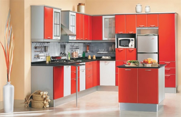 • Красный гарнитур на фоне белой поверхности. Такое традиционное сочетание тонов имеет свои вариации. Уравновесить насыщенность красного тона призвана теплая палитра белого — цвет слоновой кости, молочно-белый или сливочный оттенок в отделке пола, стен и потолка. Снизить агрессивную нагрузку красной мебели способна и широкая цветовая гамма от рябинового и кораллового тона, до цвета спелой вишни, бургунда и множества промежуточных оттенков. Как правило, столешница в красной мебели окрашена в белый цвет.