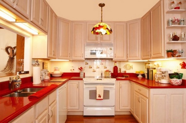 7. Не нагружать интерьер кухни мелким красным декором, фотообоями, посудой на столешнице.