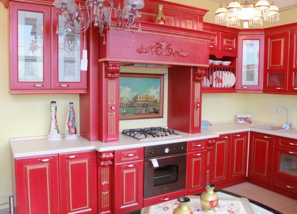 Кухонный красный гарнитур в бледном или темном оттенке с потертостями по старину, комбинируется с деревянной фурнитурой, коричневыми цветами фартука, столешницей из мозаики или массива.