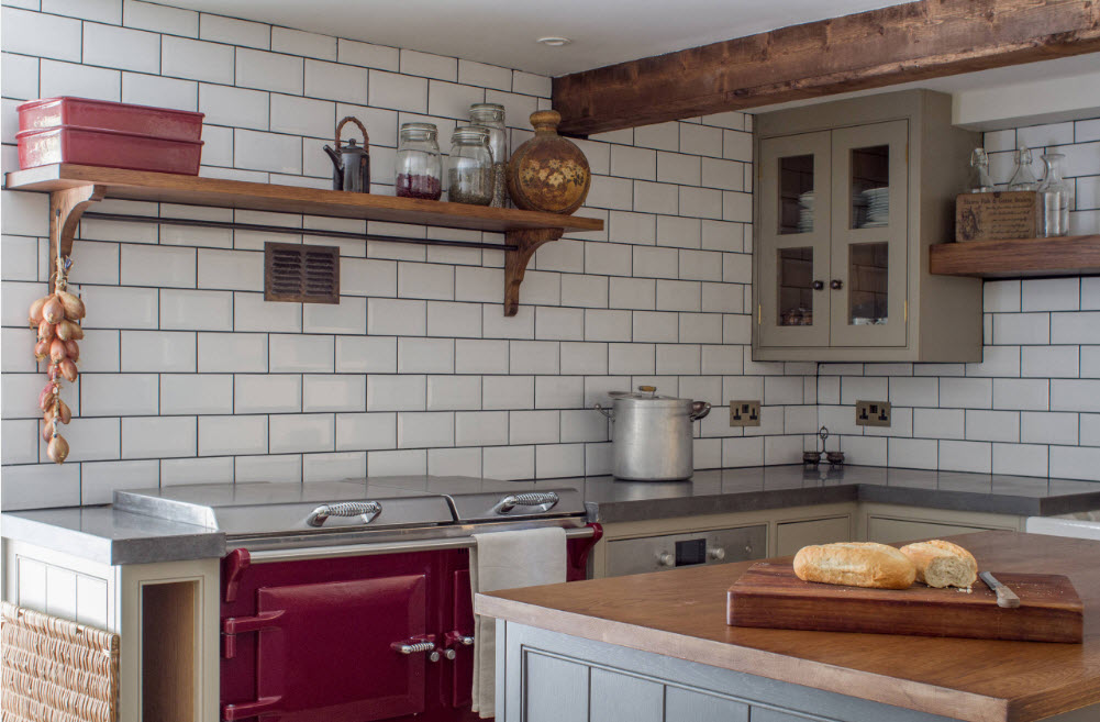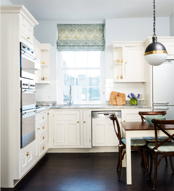 В английском кантри-стиле есть такой прием обустройства кухонного пространства – окрашивание стен и фасадов шкафов в один (или близкие по оттенкам) цвет. Чаще всего выбираются оттенки синего, зеленого или серого цветов. Выглядит цветная кухня очень самобытно, но при этом в таком пространстве комфортно всем – и домочадцам, и гостям апартаментов. В нашей стране тоже есть приверженцы использования подобных приемов в обустройстве кухни – можно найти как готовые мебельные решения в салонах, так и заказать индивидуальный проект для подобранной заранее отделки комнаты.