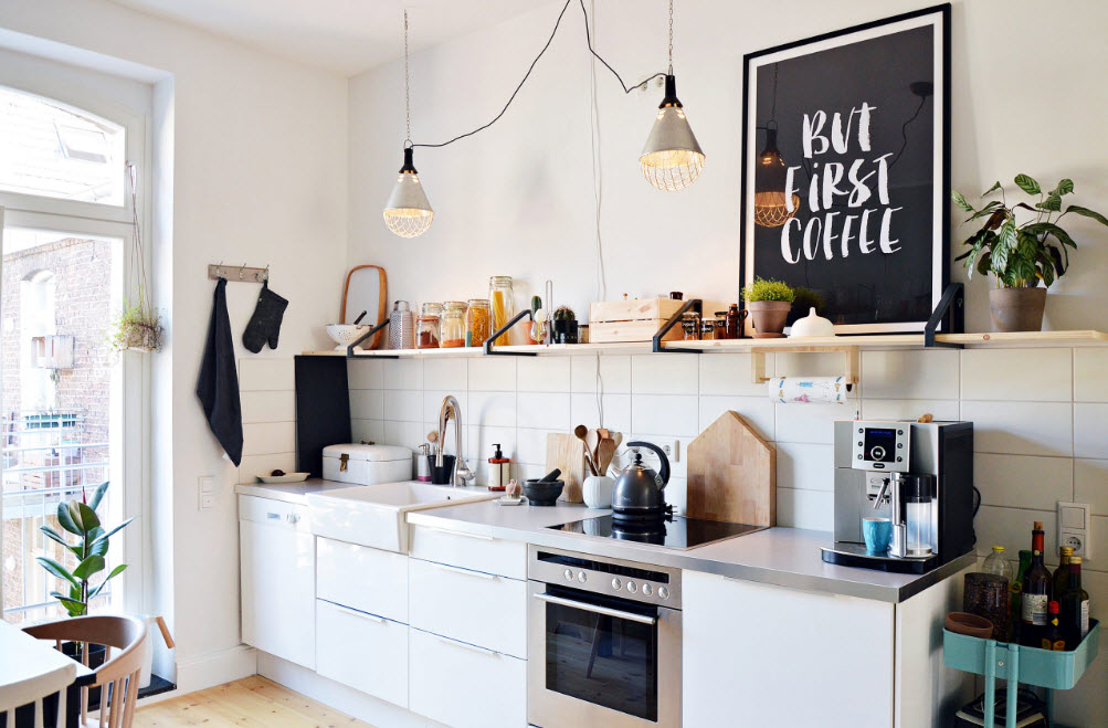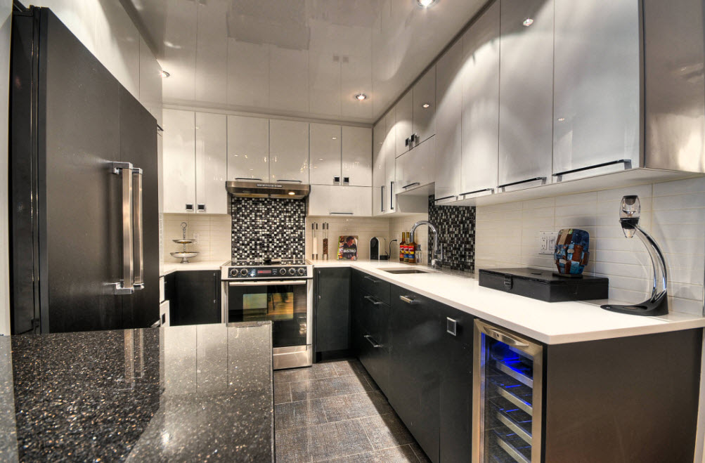 Еще одни эффектный компаньон белого цвета в создании современных кухонных пространств – черный цвет. Дозированное применение темного тона в белоснежной идиллии позволяет не только создать необходимые для взора центры фокусировки внимания, но и сделать дизайн более структурированным, четким, а иногда и драматичным. Черный цвет можно использовать для исполнения столешниц, нижнего ряда кухонных шкафов, напольного покрытия или рисунка на кухонном фартуке, элементов декора, осветительных приборов. Но важно понимать, что темные поверхности в кухонном пространстве потребуют от вас больших усилий в плане очищения, чем светлые элементы интерьера.