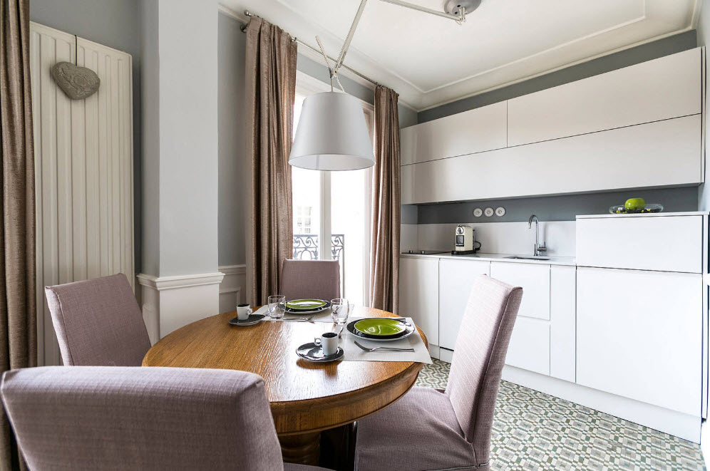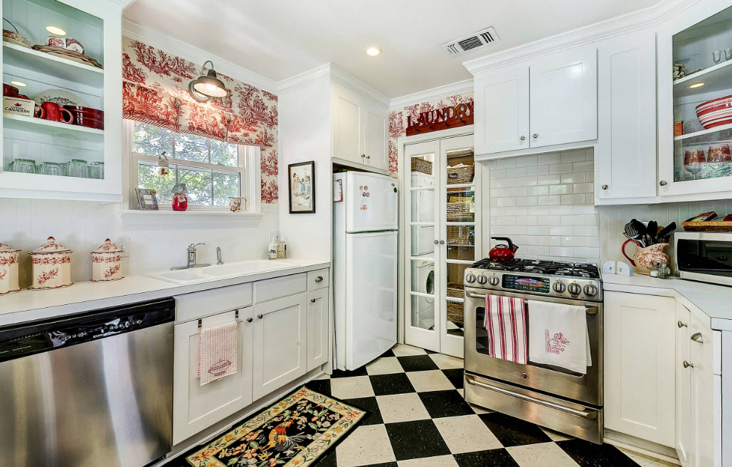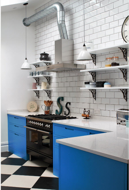 Если для вас принципиально использование белого цвета для исполнения отделки потолка и стен помещения кухни, а также фасадов мебельного гарнитура, примените цвет в облицовке полов. Темное, контрастное напольное покрытие не только внесет разнообразие в цветовую палитру помещения, но и поможет визуально создать четкие границы пространства. Напольная плитка с пестрым рисунком или выложенная по принципу шахматной доски, станет изюминкой светлого интерьера и поможет придать тривиальному образу кухни оригинальности.