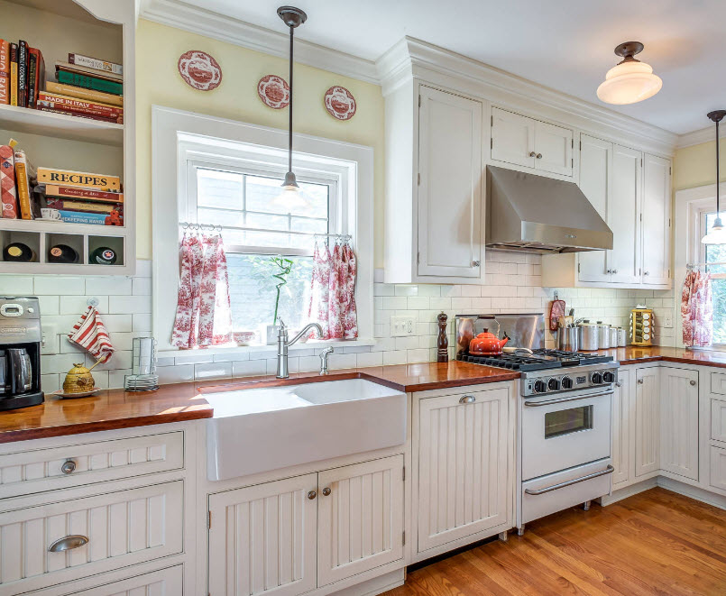 В современных способах оформления, если Вы посмотрите на фото, видно, что один светильник уже не используется, как это было раньше, в былые времена. Основной свет в кухнях делают мягким и ярким. Светильники рекомендуется подбирать очень тщательно, чтобы они дополняли интерьеры, придавали акценты, шарм, и конечно – уют. Рабочую поверхность следует оснастить дополнительным освещением, но при этом оттенок не должен быть таким, чтобы цвета продуктов и приготовленных блюд искажались.
