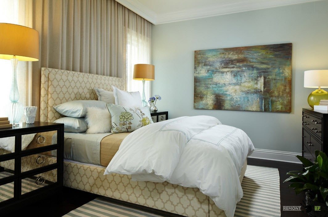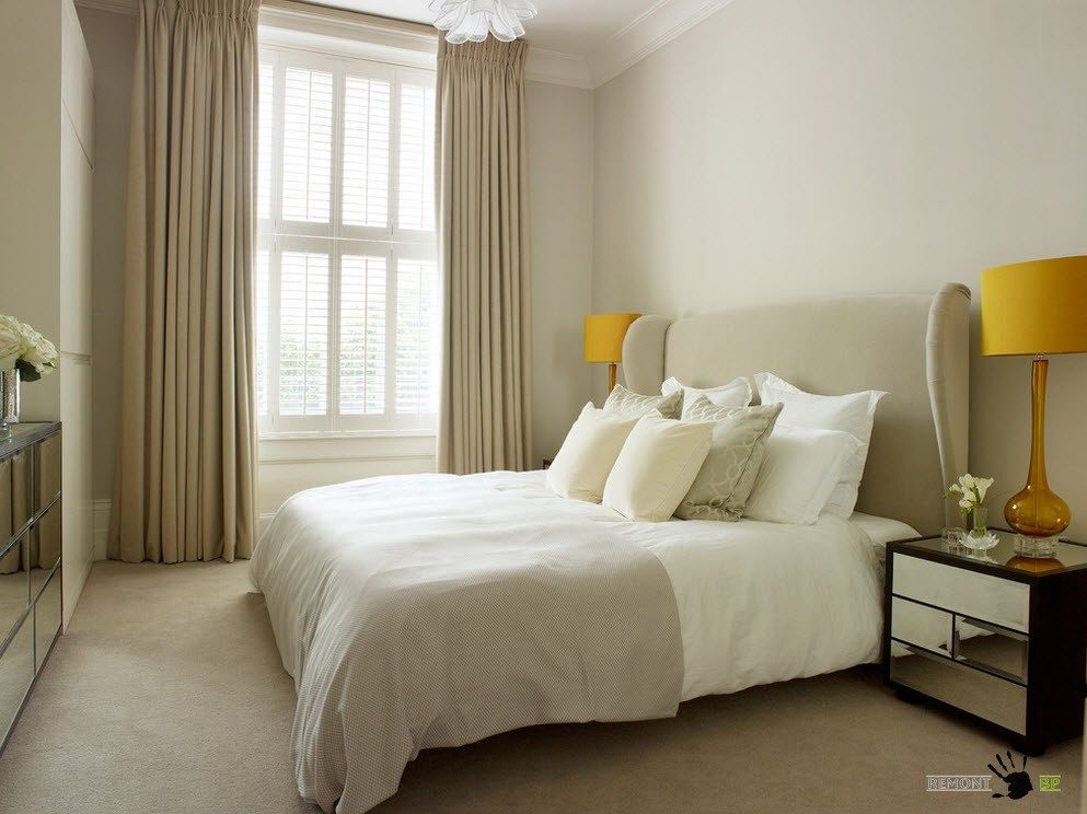 Если интерьер спальни выполнен в светлых, сдержанных тонах, то акцентными пятнами могут послужить любые функциональные или декоративные предметы. Например, яркие настольные торшеры прекрасно смотрятся в интерьере со светло-бежевой палитрой. А зеркальные поверхности прикроватных тумбочек и комода позволяют создать визуальный эффект размытости границ и расширить помещение.
