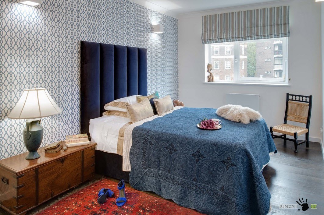 Еще один вариант оформления акцентной стены с помощью обоев с принтом – белый цвет стен и синий тон обивки изголовья кровати нашли отражение в пестром рисунке отделки вертикальной поверхности.