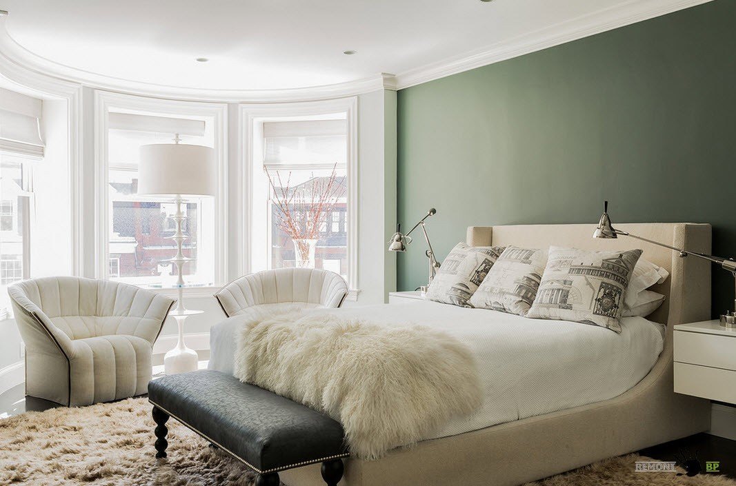 Если ваша спальня не может похвастать большой площадью, но в ней есть эркер, то это прекрасная возможность организовать зону для отдыха, чтения и бесед возле окна. Пара элегантных кресел или софа и напольный торшер не займут много места, а возможностей предоставят массу.