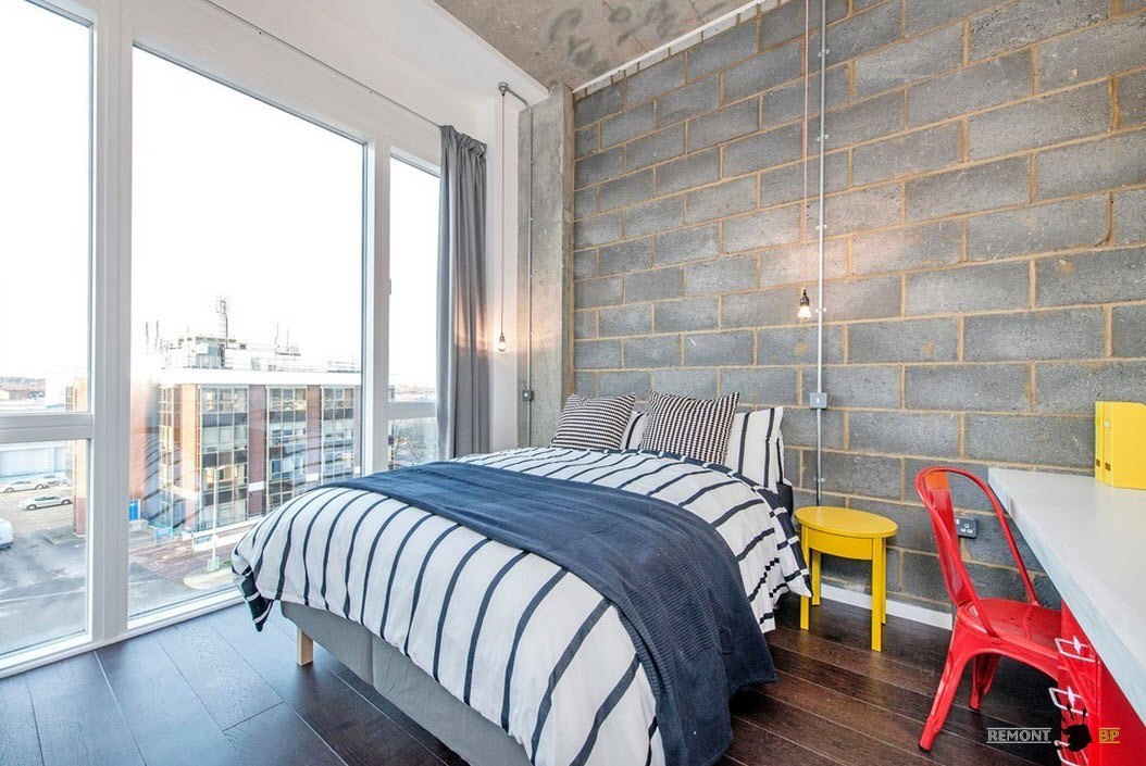 Акцентная стена в виде блочной кладки – прекрасная возможность создать уникальный интерьер спальни с элементами индустриализации и стиля поп-арт. На фоне серых стен особенно эффектно смотрятся яркие предметы интерьера и пестрый текстиль.