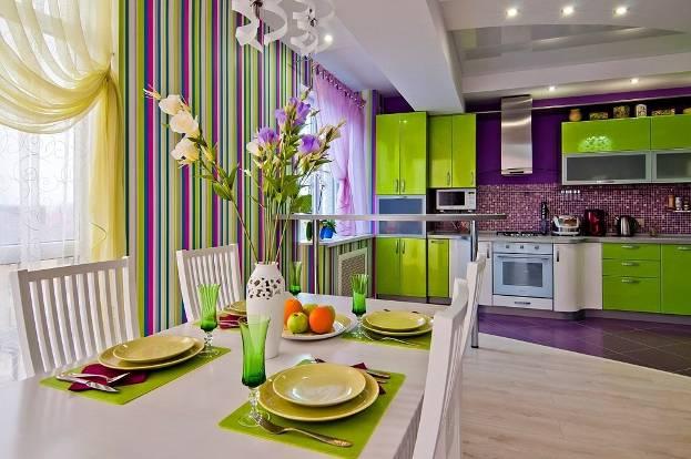 Смелое сочетание зелёного и фиолетового цвета на кухне в стиле «модерн»