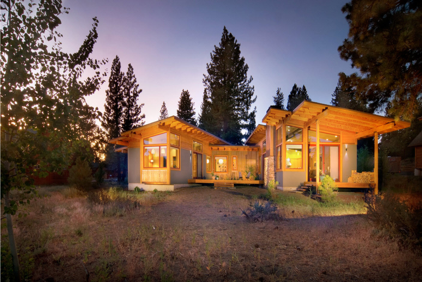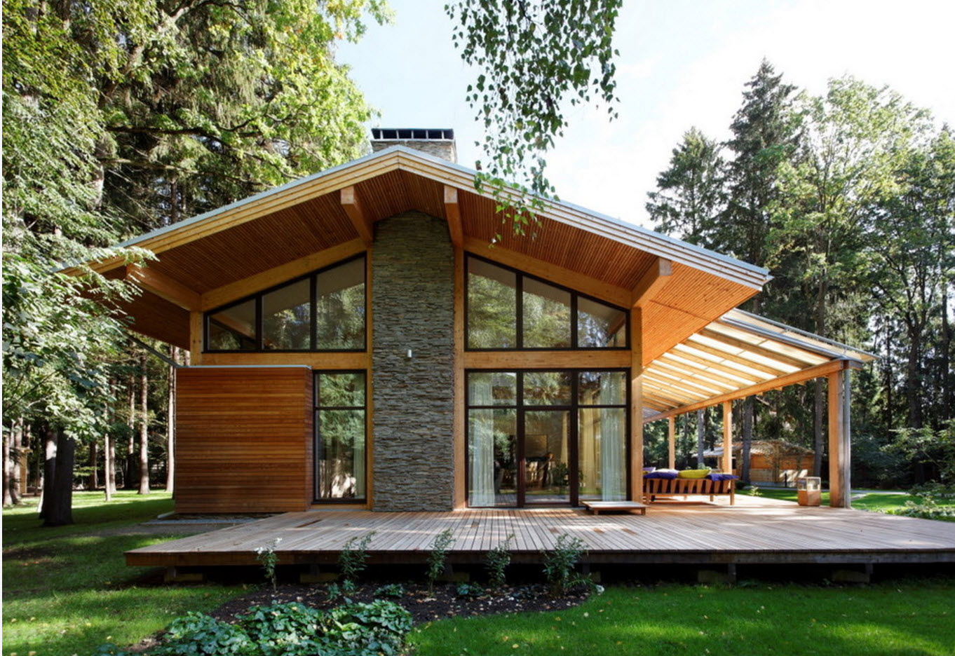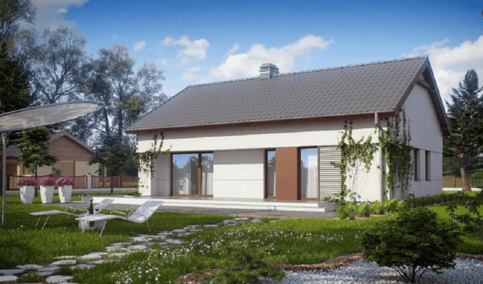 Широкое развитие частного строительства наблюдается на загородных дачных участках. Временное проживание не требует больших жилых площадей, поэтому часто обращаются к проектам одноэтажных домов. Двускатная крыша в этом случае будет оптимальным вариантом. Предлагаем вниманию несколько интересных вариантов уютных строений. Двигаться будем в направлении от более просторных помещений к компактным частным одноэтажным домам.