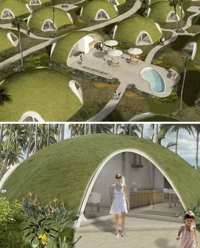 Футуристические эко-квартиры Binishells – проект Ника Бини (Nic Bini). Технологию строительства «норки» дизайнер позаимствовал у отца-архитектора. Данте Бини (Dante Bini) разработал куполообразную конструкцию, которую можно в прямом смысле надуть до нужного размера (максимальный диаметр – 36,5 м). Основа строится из чередующихся цемента и полимерных материалов, после чего пустоты между слоями накачиваются воздухом. Узнать больше «о норке хоббита из будущего» можно на сайте компании Binishells.