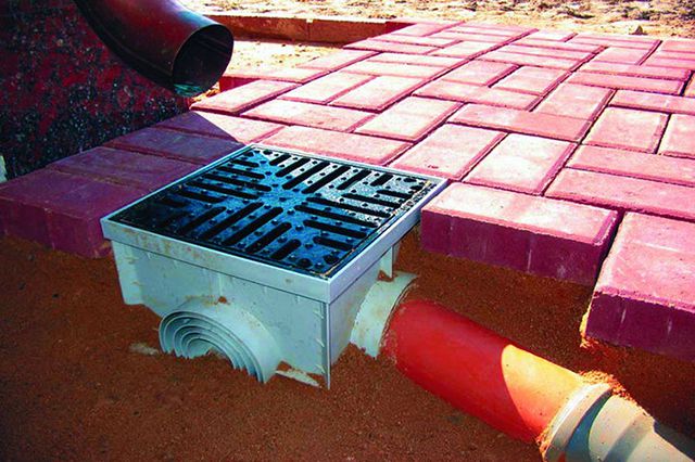 - желобами, пескоуловителями и дождеприемниками (пластиковыми либо бетонными);