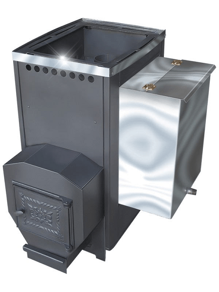 Вмонтированный контур нагрева воды позволяет комплектовать печь ёмкостью до 120 литров. Чаще всего она устанавливается наверху, исполняя роль согласующего элемента, между горячей трубой и потолочным перекрытием. Пользователь получает двойную выгоду — труба нагревает жидкость в баке, который позволяет не использовать защитные материалы для изоляции трубы от материалов перекрытия и потолка. Цифра 120 не может служить окончательной характеристикой модели, приобретая печь в комплекте с баком, его размер можно ограничить до 50 или 60 литров. Данная модель позволяет установку водяной ёмкости в другом месте (за пределами парилки).