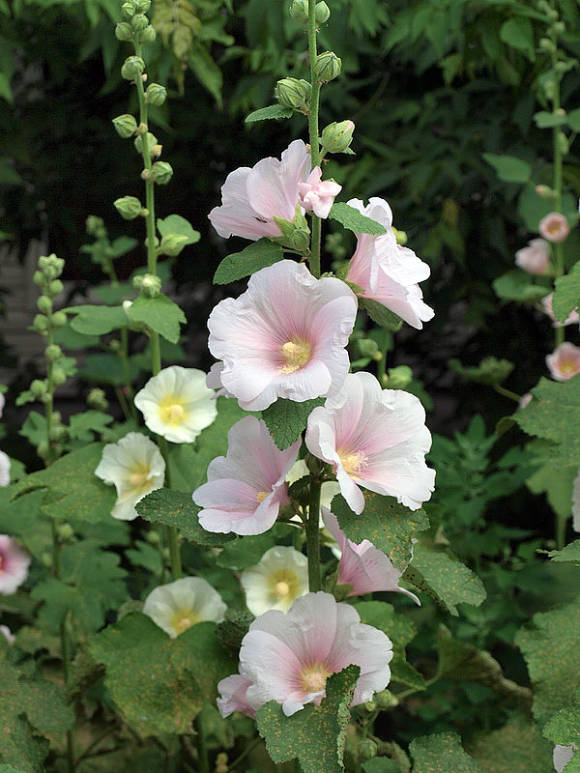 Украсит задний план цветников или закроет некрасивый забор или стену. Это растение дает высокий стебель до 1,5-2 метров, на нем располагаются крупные зеленые листья, а в пазухах раскрываются большие цветки с нежными лепестками. Цветки раскрываются поочередно от низа к верху, поэтому цветение шток-розы длится больше месяца. Это растение будет пышно цвести только на солнечном месте с плодородной рыхлой землей. На высоком цветоносе может образовываться до 200 цветков. Сорта шток-розы бывают с простой формой или махровые, в диаметре они достигают до 12 см, с самой разной окраской.
