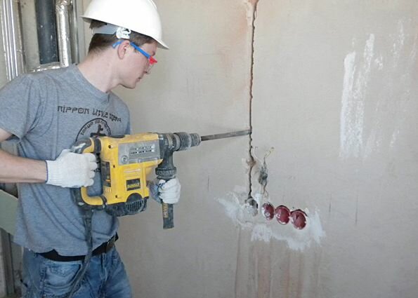 После того как отверстия готовы по намеченным линиям прокладки электропроводки штробим стену. По технологии это делается следующим образом: Сначала специальным штроборезом в бетоне стене выполняются 2 параллельных пропила, после чего бетон между этими пропилами выбиваются перфоратором: