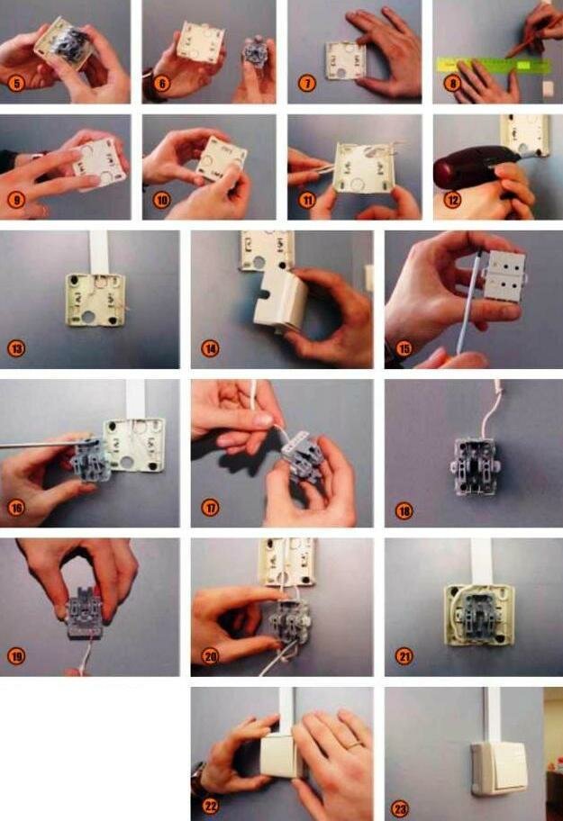 Установка выключателей ничем не отличается от монтажа розеток. Главное – правильно установить колодку. Включение должно осуществляться путем нажатия на верхнюю часть клавиши.