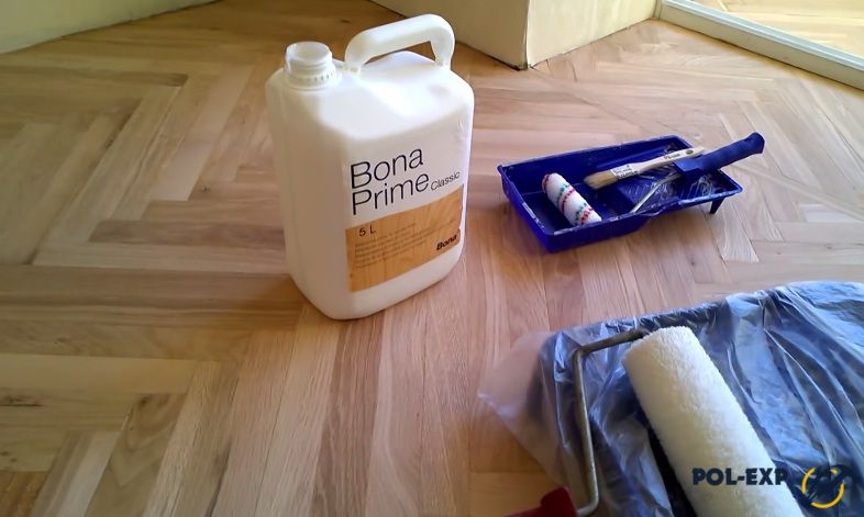 Шаг 9. Сухой и чистый паркет покрывают слоем грунтовки. В углах состав наносят щеткой, всю остальную поверхность удобнее грунтовать валиком. Грунтовка должна покрывать пол сплошным слоем, но без наплывов, равномерно.