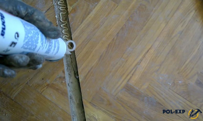 Шаг 4. Поочередно в каждое отверстие вставляют носик пистолета и закачивают клей. Можно выдавливать клей прямо из тубы, если она снабжена наконечником. Излишки клея нужно сразу аккуратно вытереть, чтобы не пачкался пол.