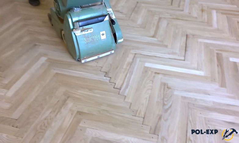 Шаг 5. Выполняют циклевку паркета. На барабане циклевочной машины закрепляют наждачную бумагу с крупным зерном (Р24) и приступают к обработке поверхности.