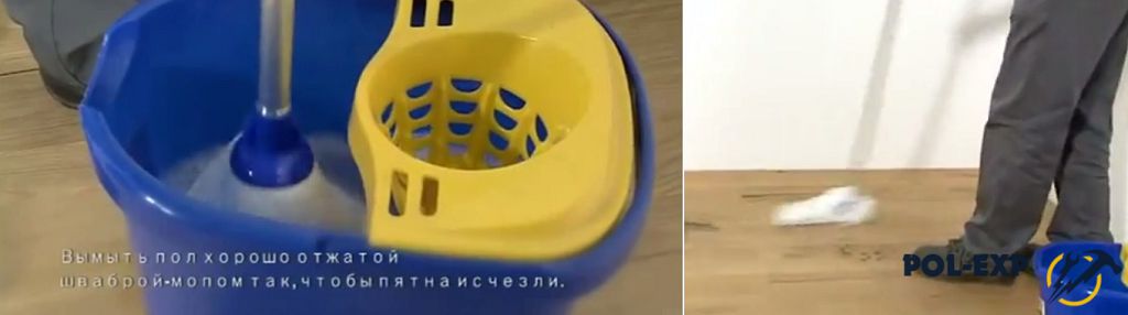 - Влажная уборка теплой водой. Это поможет смыть все средства, которые использовались ранее. Важно, тщательно выжимать тряпку. Паркет не терпит влагу.