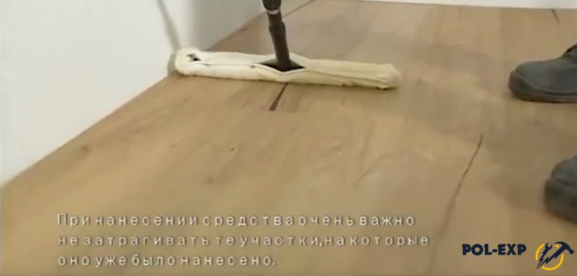 Специальный концентрат разводят с водой в пропорции 1 к 10. Остатки влаги следует удалить пылесосом с возможностью всасывания. Далее необходимо повторно вымыть пол начисто и просушить. После этого паркетную доску можно при необходимости отшлифовать, пропылесосить, протереть влажной тряпкой, нанести масло/воск, отполировать, повторно промаслить, сутки просушить и неделю не мыть. Следует, однако, помнить, что шлифовать ее можно только при укладке паркетной доски на клей.