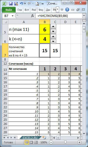 Примечание: Это статья о подсчете количества сочетаний с использованием MS EXCEL. Теоретические основы советуем прочитать в специализированном учебнике. Изучать сочетания по этой статье — плохая идея.