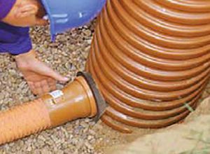 4. Когда слой щебня выложен, на него можно укладывать трубопровод. На том участке, где труба будет соединяться с бетонным кольцом, необходимо сделать отверстие, диаметр которого должен немного превышать диаметр трубы.