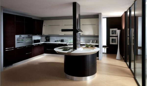 Полностью соответствует принципам высокой технологичности мебель для кухни с радиусными фасадами. Это наиболее дорогой вариант оформления дизайна.