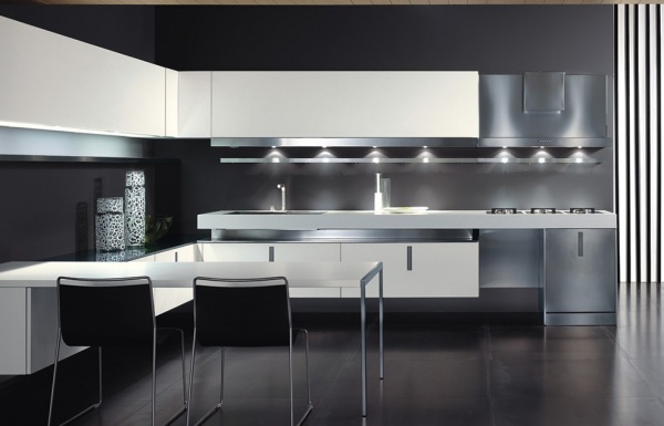 Интерьер кухни, где прослеживается четкое соблюдение принципов стиля хай-тек, демонстрируют фото: