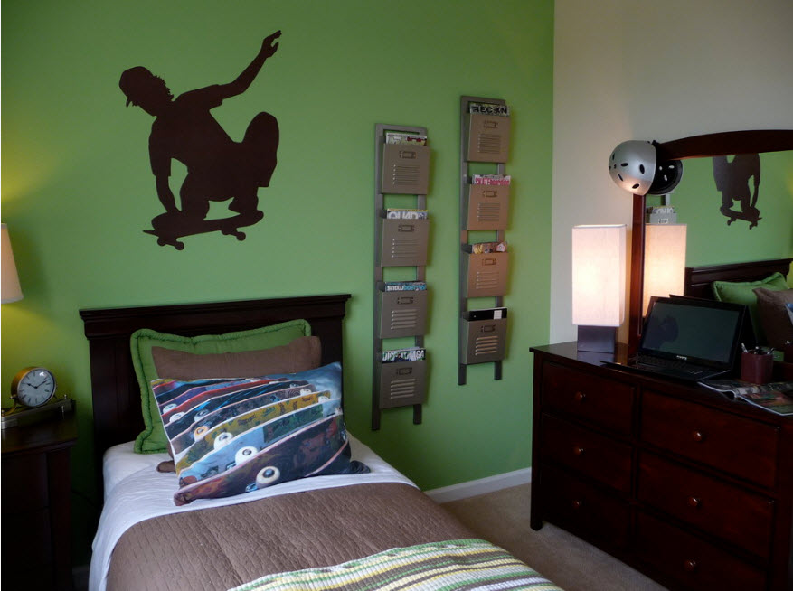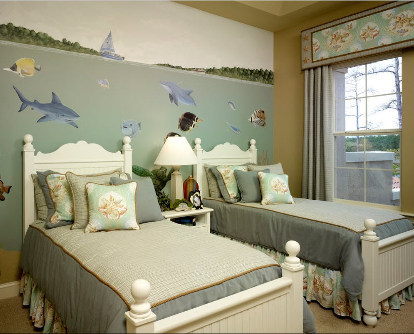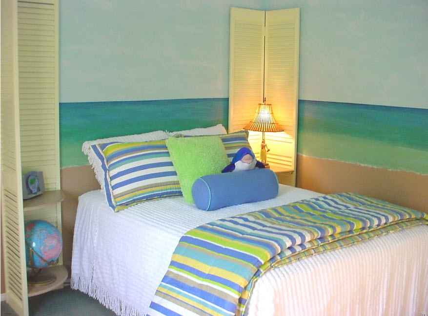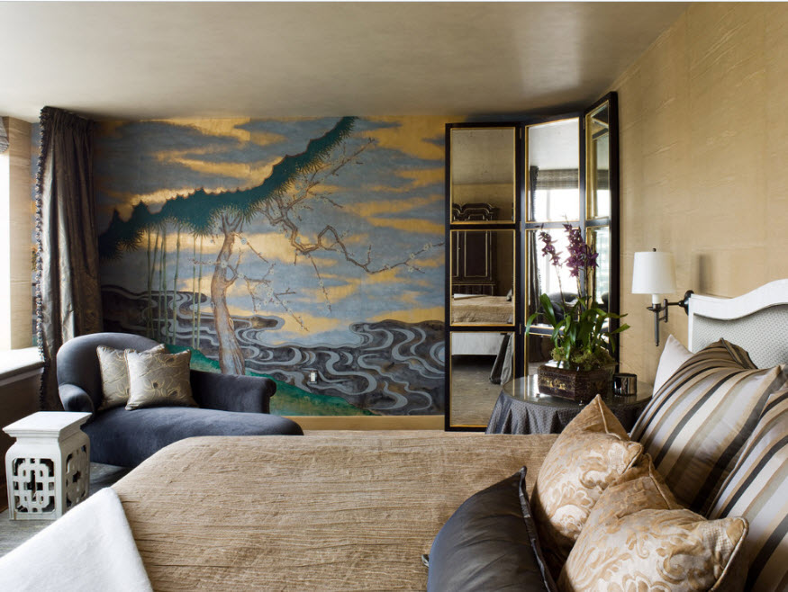 Спальня используется исключительно для отдыха, поэтому каждый предмет интерьера этой комнаты должен быть рассчитан на комфорт и расслабление. В росписи обычно превалируют природные мотивы. Пейзажи, панорамы водного мира, зелень сочной травы или головки ярких цветов помогут успокоиться и подготовиться к крепкому сну. Расписывают, как правило, стену над изголовьем кровати, так как в большинстве случаев она акцентная. В этом же помещении часто декорируют подобным образом еще и потолки. Не советуют прибегать к темным тонам, которые сделают комнату визуально меньше и будут психологически давить на владельцев.