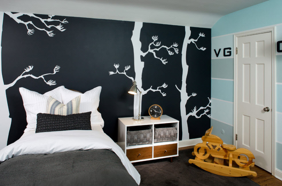 Трафарет для росписи стен можно купить уже готовым в наборе с краской. Большое количество рисунков в интернете позволяет изготовить его самостоятельно. Далее достаточно кисточки или валика для создания неповторимого изображения на стене.