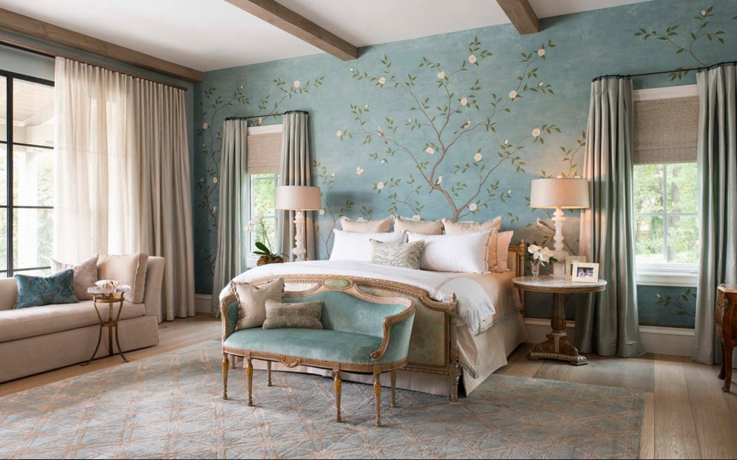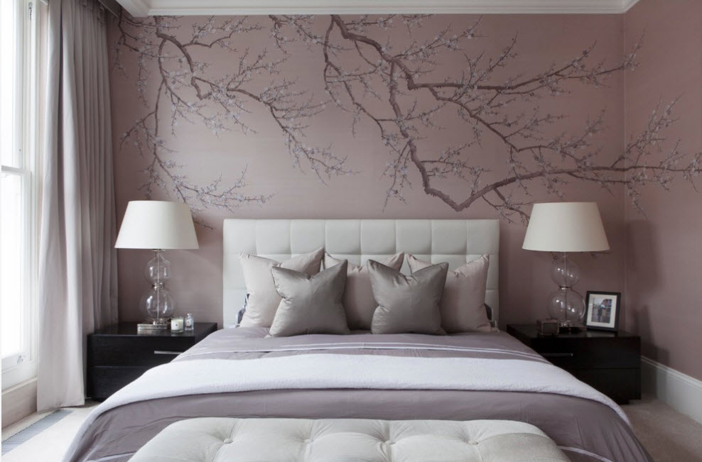 Чаще всего для спальных помещений выбирают романтичный стиль исполнения рисунка на стенах. Большинство из нас стараются создать максимально расслабляющую и успокаивающую атмосферу в помещении для сна и отдыха. Поэтому нежные оттенки в изображении цветочных мотивов или легких пейзажей становятся центральной темой в интерьер спальни.