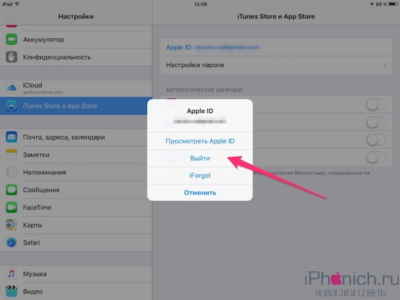 Шаг 1: Для начало нужно выйти из своей учетной записи Apple ID, зайди в «Настройки» → «iTunes Store и App Store» нажмите на Apple ID: твоя@почта и нажми «Выйти».