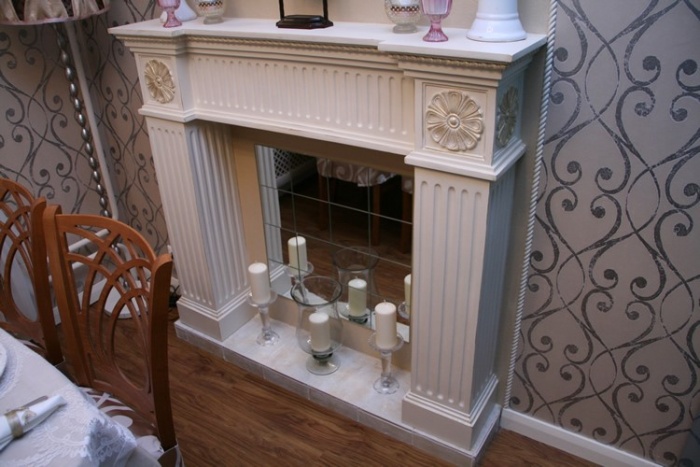 К примеру, вы можете прикрепить к задней стенке «топки» такого камина зеркало. Благодаря этому приему глубина «топки» увеличится. Для пущего эффекта над порталом можно закрепить деревянную полку, стилизованную под каминную.