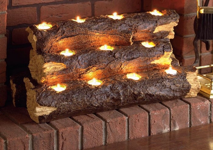 Существует интересный способ эффектной подачи свечей в камине. Для этого понадобится несколько средних аккуратных поленьев. В каждом вырезаем 2-3 углубления размером с маленькую свечку в металлической подставке. Итогом станет утонченная имитация каминного огня при минимальных затратах финансов и времени.